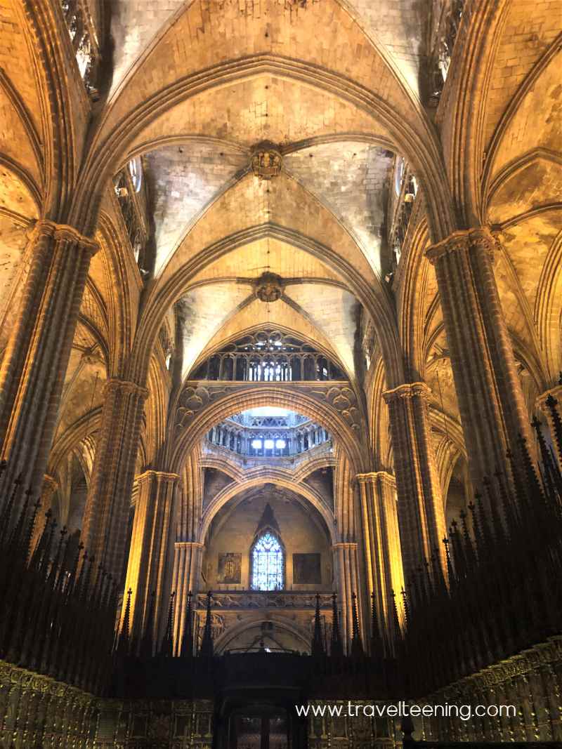 The hubs needed a break from sightseeing so the three of us headed off to the Gothic quarter to explore.  Our tour guide from the walking tour recommended a stop at the Barcelona Cathedral so we made that a tentative destination. Note, it costs 7 euros per person between noon and 5 pm. My guess is it’s free the rest of the time. So if you must see this and would prefer not to pay, double check the pricing and the times. It was actually lovely inside and fee afforded us an elevator ride to the roof to look over the city.
