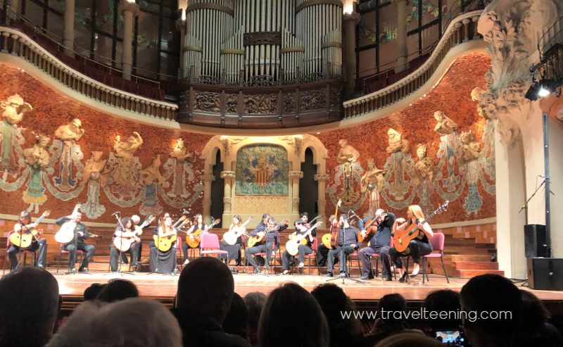Our evening included another performance. The Palau de la Música concert hall was recommended (another UNESCO World Heritage site), and I prefer to attend an actual performance. The building is striking and the ceiling with its roses and stain glass is certainly unique. I booked a guitar orchestra concert a few weeks out as it seemed like the performance that would pack a powerful punch. This talented group of musicians delivered complete with a violinist, pianist, and Spanish dancer.  If you would like to visit this venue, I recommend actually seeing a performance. Consider it a cultural experience.