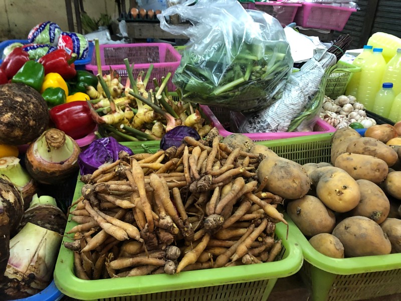 With cold water bottles in hand (provided by the restaurant), we moved along to visit the market. Pema walked us through the basement to explain some of the main flavors of Thai cooking–chili, lemongrass, ginger, tamarind, lime leaf, shallots, and squash (including one called Fuk, which she found hilarious). Clearly the vendors knew her and were happy to play along for the eight Western tourists. It was interesting to take in all the smells and understand a bit more about how ingredients are used.
